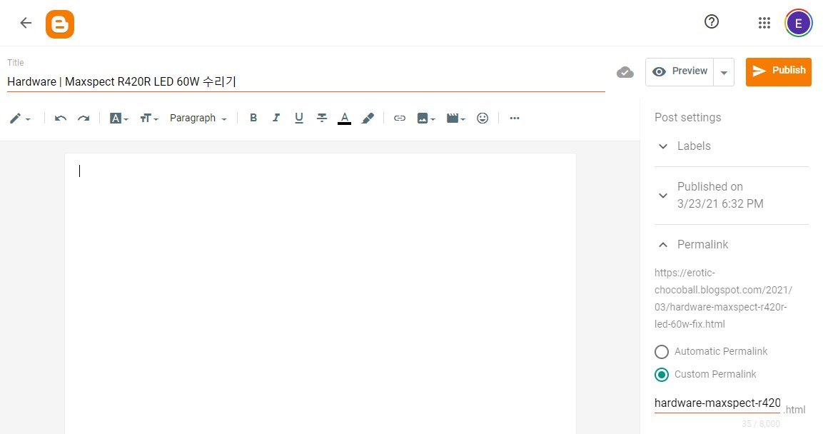 노출된 글의 URL 을 자동으로 할 수 있으며, URL 이 마음에 들지 않는다면 수동으로 해도 됩니다.