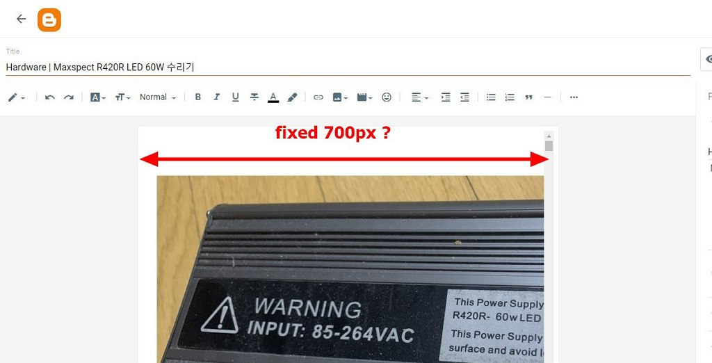 테마 문제일 듯 한데, editor 폭이 700px 로 고정되어 있습니다.